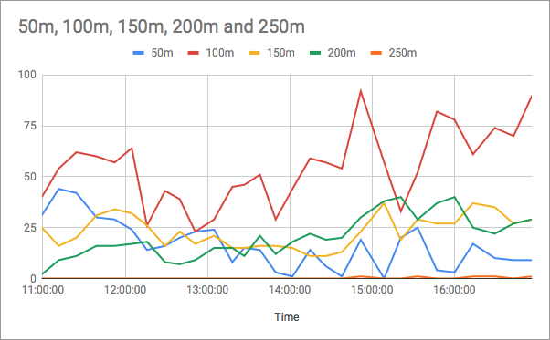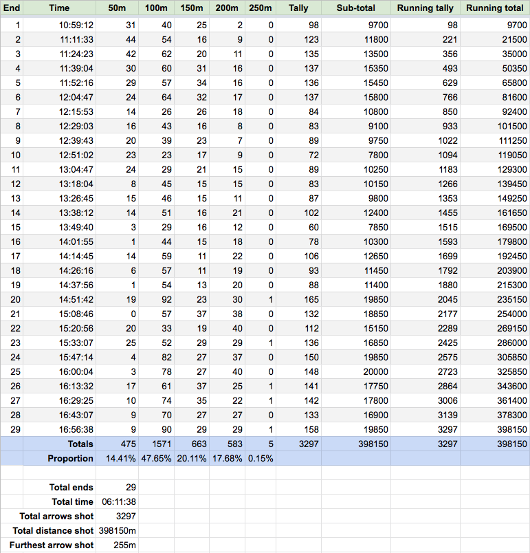 No, just kidding. But here are a few of the fabulous statistics provided by our very own Dan. As you can see from the first image, it was difficult to determine how long it would take you from the first end. And it was amazing to see how diffiuclt it was to shoot over 250 metres and certainly not until the end of the day.