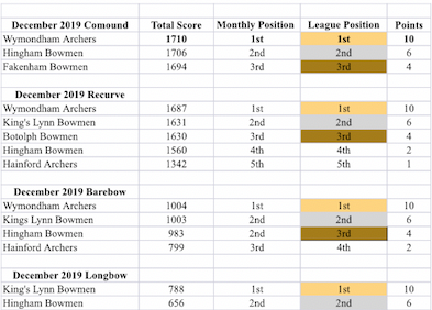 Wymondham Archers are doing quite well this month with our efforts on the Winter Postal League. Well done to all that have taken part in the tournament and handed in scores; you are so very much appreciated. Remember it's all a little bit of fun and healthy competitiveness between the clubs in Norfolk. As you can see we are neck and neck with Hingham, our beloved rivals down the road. Please can you make every effort to get to the postal league days when they are advertised. And here is the first January 18th 2020 at Club - a Portsmouth Round. Ta very much.