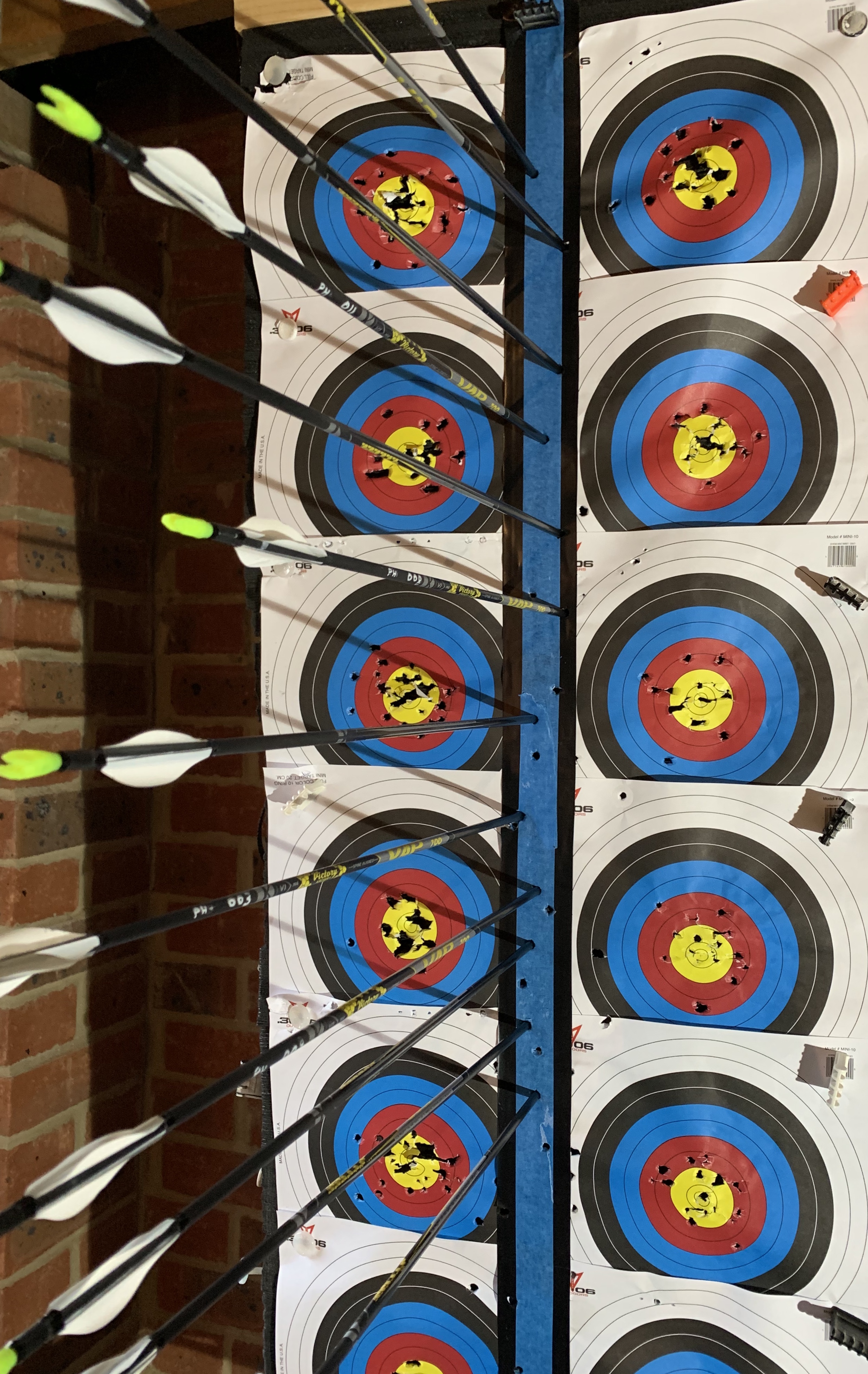 Getting better at what we do can challenge us to the limit. Setting increasingly more difficult goals is all at once tiring and rewarding. At Club we operate the 252 scheme for our outdoor season where we simply try to score the same score but with moving the target further and further away. Indoors we don't have such luxury but we do use the 'Portsmouth Badge' scheme where the rewards are additonal bling each time you score a round within the parameters of the new award. You'll see the image I've placed here that shows 'tape shooting' when I'm shooting in my garage when I occasionally place a strip of black tape down the middle of my boss and then over that a strip of low-tac blue masking tape. I aim at getting the arrows, shot from around 5 metres away into the blue strip. It is very challenging and occasionally very rewarding. It enables me to focus on the left to right of my shot and not to focus too much on the up and down. I set my sight so that after I've shot my first arrow, aiming at this causes me to hit the tape (if I'm lucky) slightly above the previous arrow.